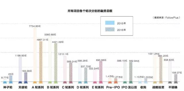 FollowPlus提供的数据显示,据不完全统计,2015年获得第一次投资的项目数量为2833个,2016年为861个。那些尚未产生正向现金流的公司不得不面临下一轮的融资难题。两年中,所有公司所有轮次获得的融资金额总额分别为2.11万亿和1.72万亿。