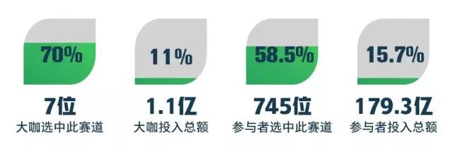 根据报道显示,新一波的人口红利给教育行业带来机会,80后、90后年轻的父母在教育领域有较大的消费痛点和消费能力。本次活动中,10位大咖有6位选中这一赛道,1人投出最高金额。在1200+参与者中,616位选中这一赛道,占比接近50%。