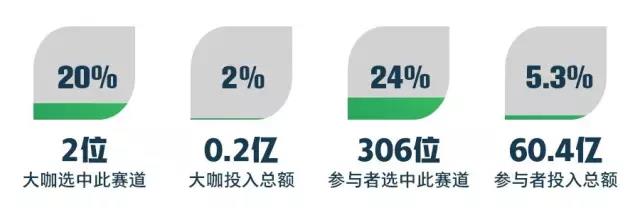 本次活动中,无论投资大咖、还是参与者都将目光瞄准了消费升级领域。10位大咖全部选中此赛道,投入资金总额2.2亿美元,其中5位大咖在此赛道投入超过2千万美元虚拟资金。1200+参与者中,有854位选中此赛道,投入资金总额217.4亿美元。