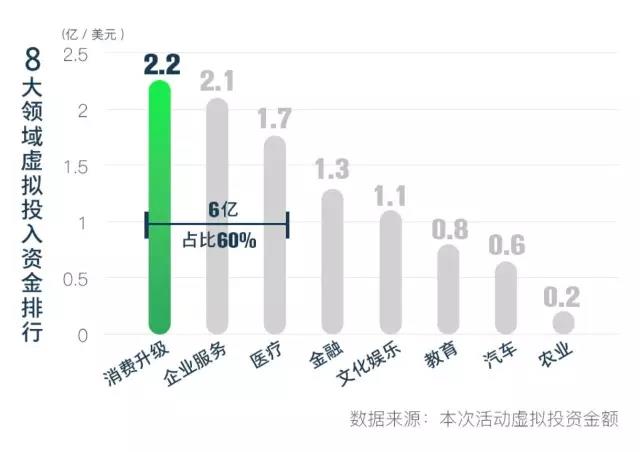 根据本次游戏虚拟投资数据显示:2017年,10位投资大咖最愿意“花钱”的TOP3领域为消费升级,企业服务、医疗。在这三个领域中,他们共同投入了6亿美元,占虚拟投资总额的60%,金融、文化娱乐、教育、汽车与农业5个领域瓜分了剩余40%的资金。