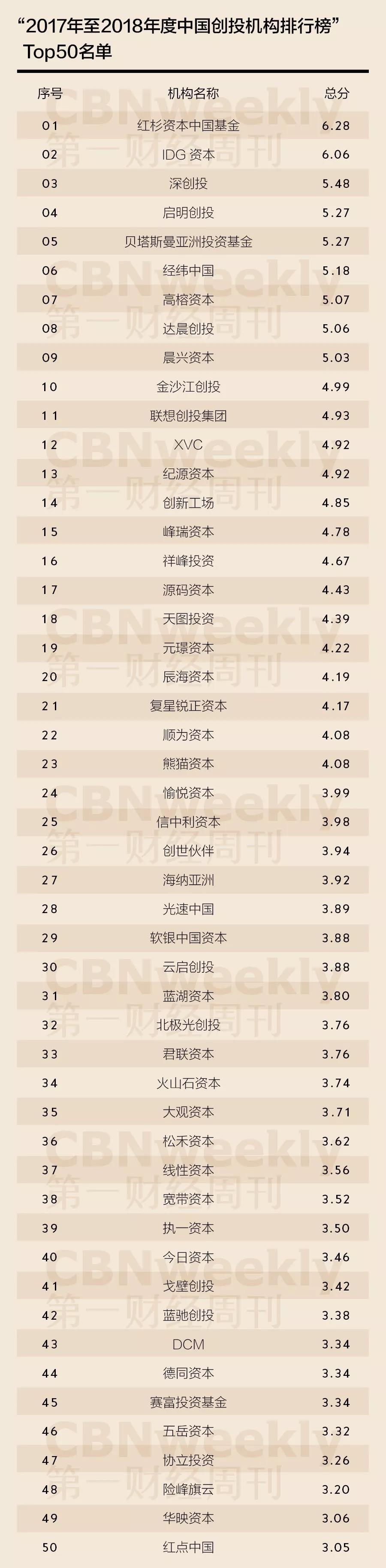 ▲ 《第一财经周刊》“2017年至2018年度中国创投机构排行榜”Top 20