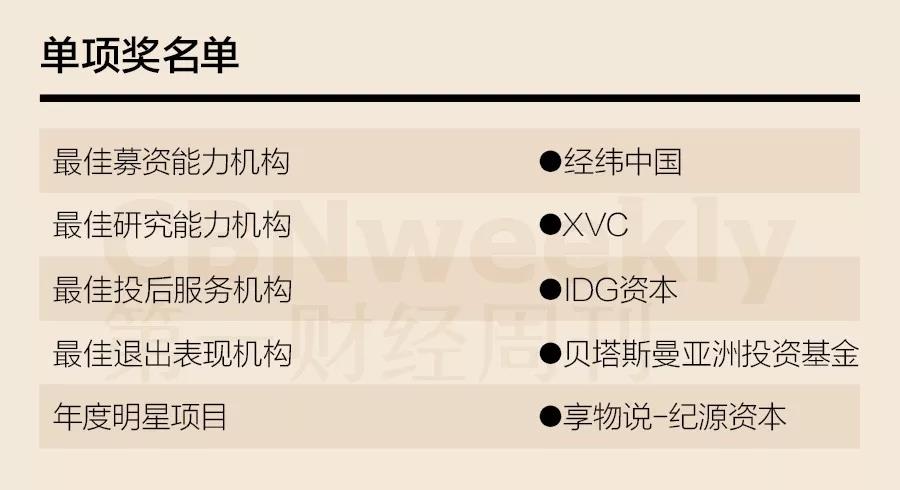 ▲ 《第一财经周刊》“2017年至2018年度中国创投机构排行榜”机构单项奖名单