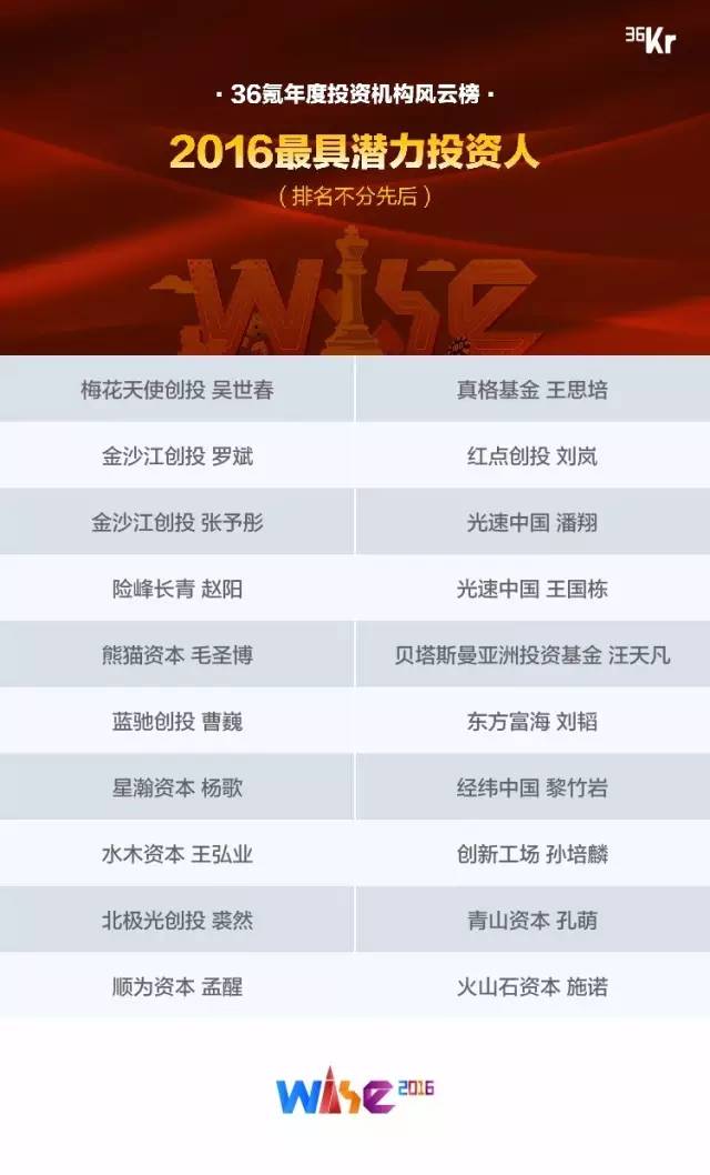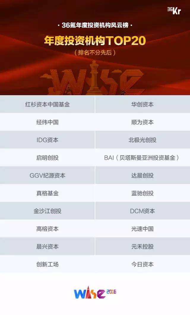 本榜单基于36氪媒体、氪空间与投融资服务在内的生态大数据及合作伙伴的第三方数据源综合评估而形成,根据机构成立年限、机构规模、机构活跃度、机构投资能力以及机构影响力等5个标准进行筛选 。最终形成的三个榜单包括:年度投资机构TOP 20、年度新锐投资机构TOP 10和2016最具潜力投资人,旨在针对创投圈优秀的头部及新锐机构作出盘点,发现最优秀的投资者,总结数据,归纳价值;同时面向未来,为行业发展作出借鉴和指导。