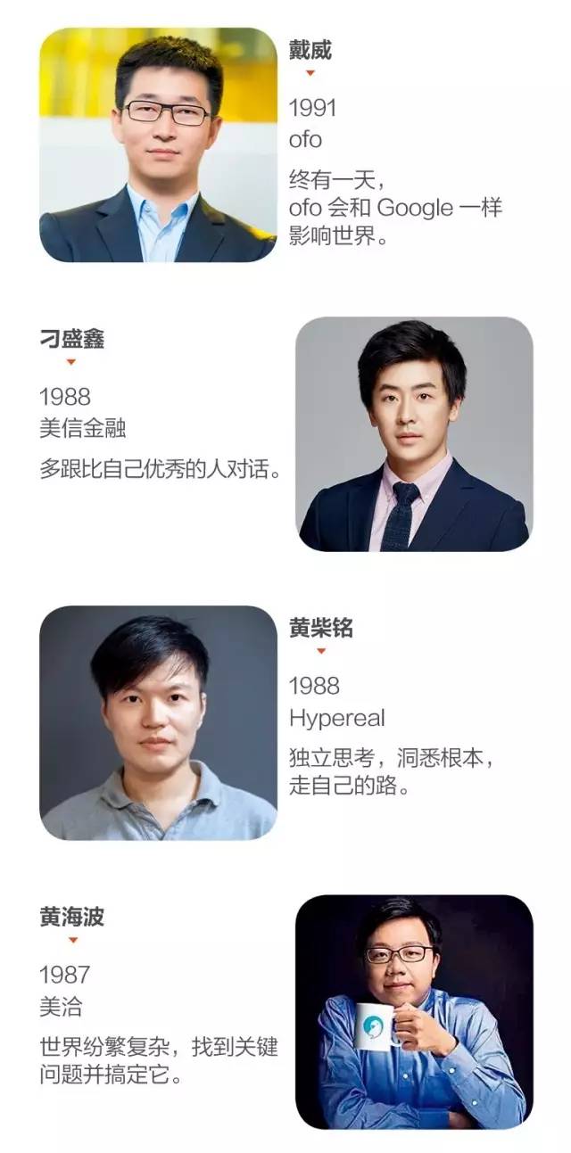 值得一提的是,创业热点有,但不扎堆。今年评选出的30岁创业新贵都属于认真踏实类型,不浮躁、不跟风。比如戴威(ofo)和黄柴铭(Hypyreal)两位创业的领域都是今年比较热门的领域,但是他们都是在比较早的时期进入,并且有自己独到的想法,而非跟风创业。