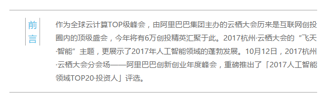 通过本次「2017人工智能领域TOP20·投资人」活动,在聚集了全国上万创投精英的云栖大会现场颁奖,表彰与致敬了那些真正深耕人工智能领域的投资人,是鼓励更多具有冒险创新精神的投资新力量诞生,也是在邀请更多人参与和开启这个属于人工智能领域的大时代。