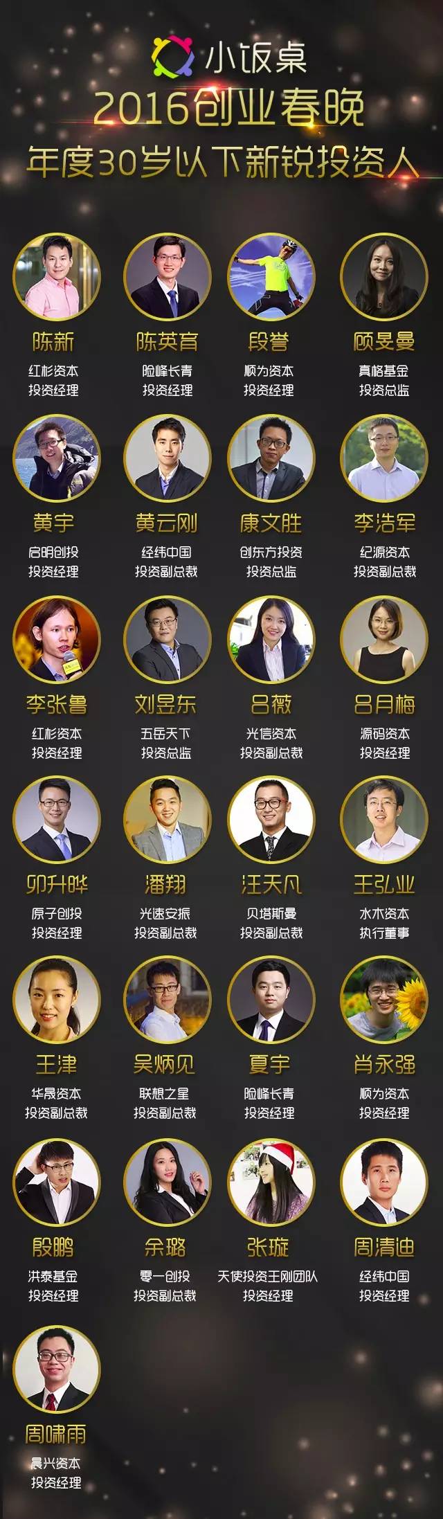 作为创业春晚的重头戏,四位投资界大佬上台隆重揭晓了小饭桌推出的“年度30岁以下新锐投资人榜单”,并为获奖者颁奖,红杉资本李张鲁、真格基金顾旻曼、欧美大片xxxxbbbb黄宇、经纬中国黄云刚、险峰长青夏宇等25位85后投资行业新秀获此殊荣。