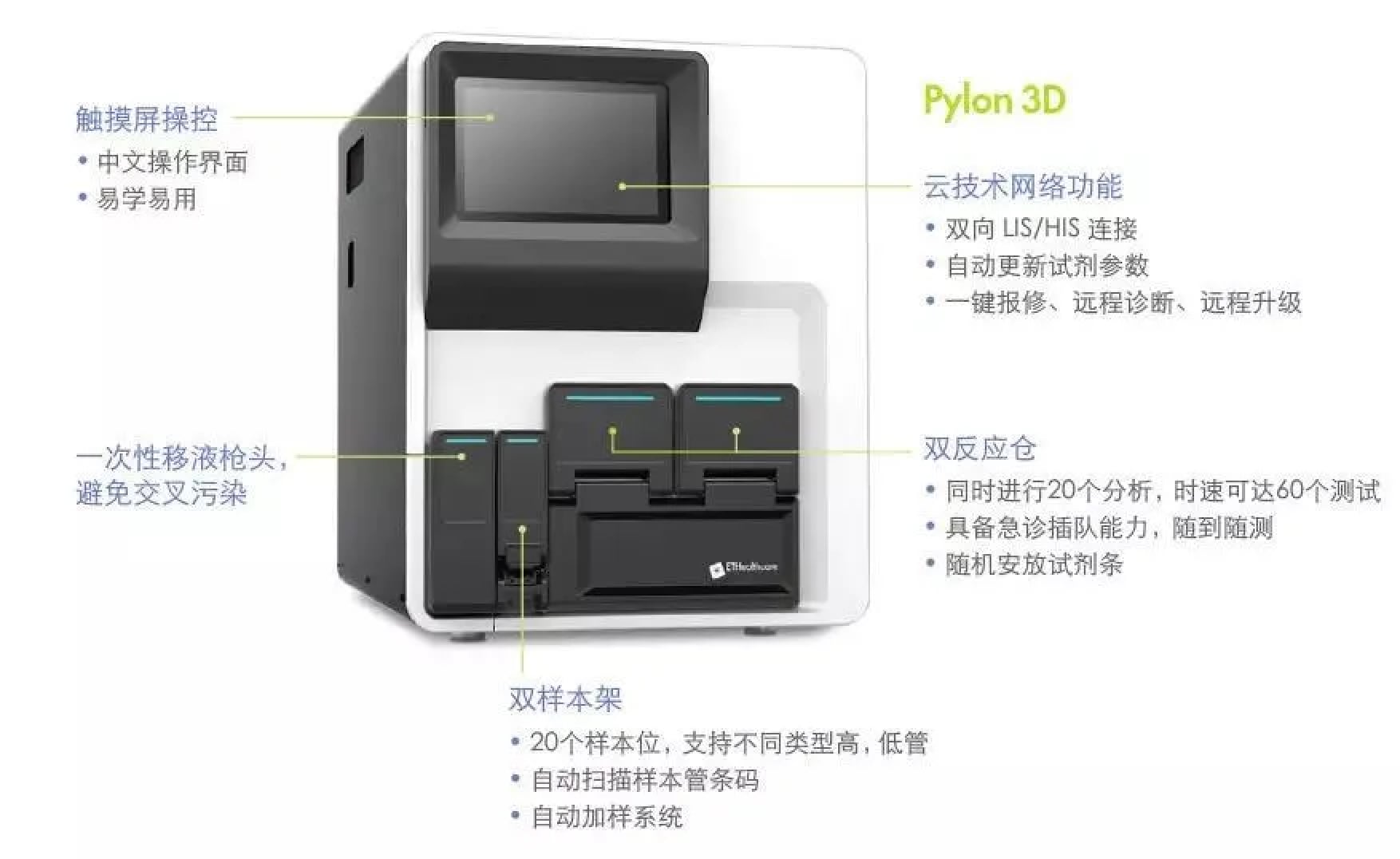 Pylon 3D免疫分析系统是星童医疗基于 Lab-on-a-tip 生物传感器技术的近患检验平台,支持各种样本类型,包括全血、血浆、血清的检测。同时,可进行小样本量检测,从而使儿科患者检验更加便捷。