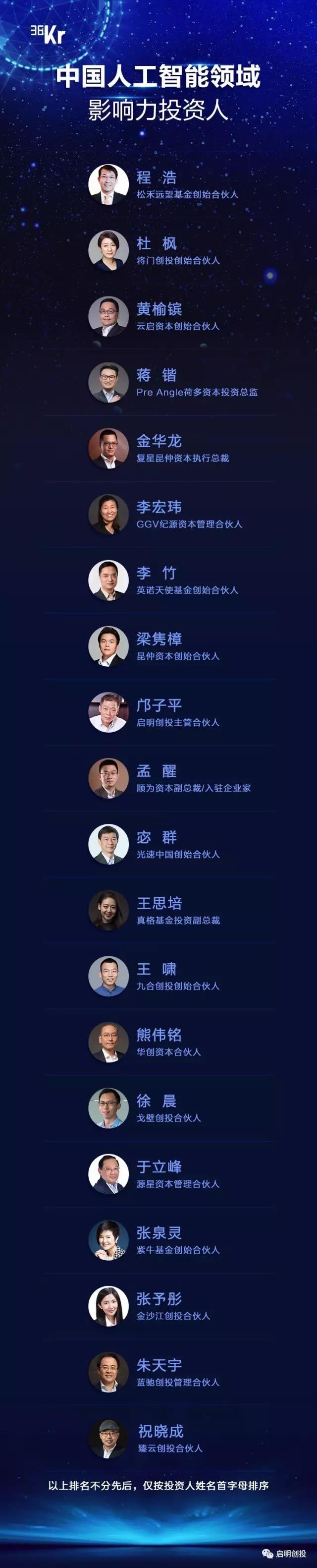 “我们致力于评选出人工智能领域最专业和专注的投资者。他们对行业长期深耕、对人工智能行业现状和发展有深刻认知、对其中存在的机遇和风险有自己独到方法论。他们不是人工智能热的跟风者,他们比追风者更早意识到人工智能的价值,同时也更深刻的相信人工智能可能带来的颠覆和改变。”36kr方面表示。