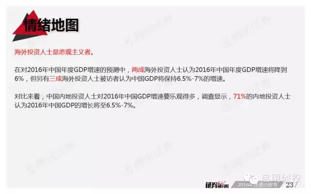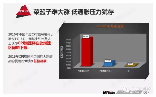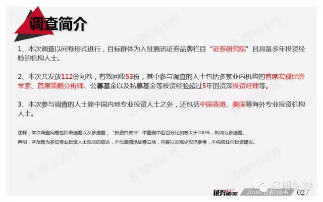 新年第二周面世的《2016年投资白皮书》由腾讯证券独家打造,该报告依托品牌栏目专家智库平台“证券研究院”,通过对近百位业内顶级大佬的调查问卷,对2016年宏观经济形势及资本市场运行做出分析预测。