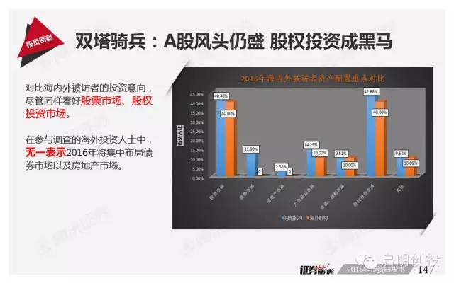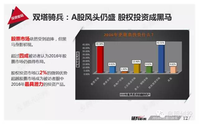 摘要:尽管投资者们依然期盼牛市,但白皮书调查显示,2016年再次出现“疯牛”行情的可能性并不大。在大类资产配置中,虽然仍有超过40%的被访专家认为2016年股市仍然是最好的投资品类,但是股权投资的“人气指数”已经逆袭,新三板等投资领域将迎来春天。