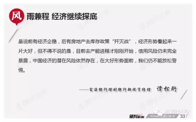 新年第二周面世的《2016年投资白皮书:繁华过后,风雨前行》由腾讯证券独家打造,该报告依托品牌栏目专家智库平台“证券研究院”,通过对近百位业内顶级大佬的调查问卷,对2016年宏观经济形势及资本市场运行做出分析预测。