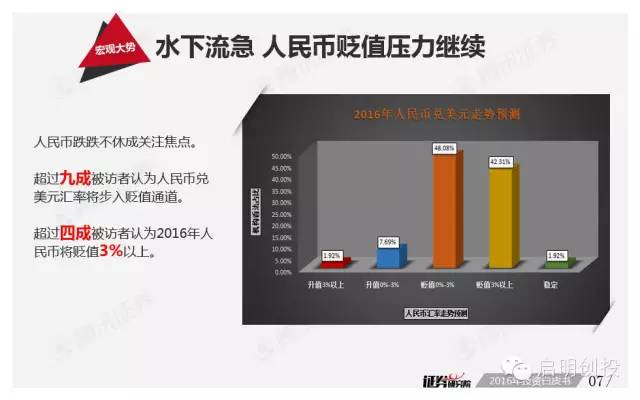 人民币贬值的压力也是2016年的投资担忧所在,超过九成被访机构认为人民币兑美元汇率将步入贬值通道。