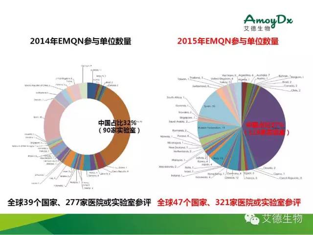 2015年12月11日,欧洲分子基因诊断质量联盟(European Molecular Genetics Quality Network, EMQN)公开发布其2015年EMQN肺癌检测室间质评结果。由艾德生物自主研发生产的ADx®系列基因检测产品凭借其优异的产品性能及广泛的使用范围,在2015年的EMQN室间质评中继续拔得头筹,产品使用率蝉联第一,检测的准确率99.4%。