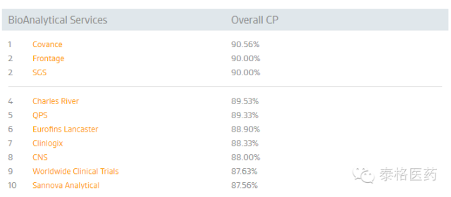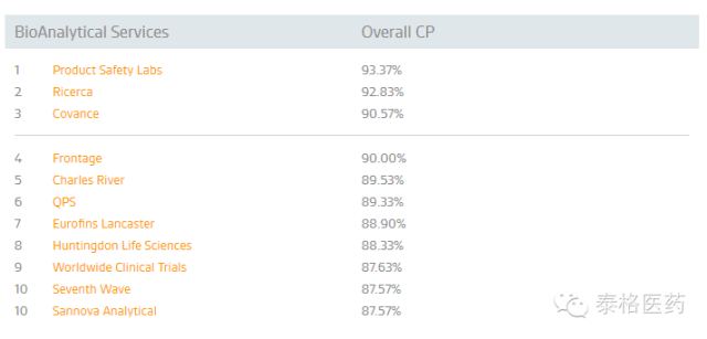 泰格医药子公司方达医药(Frontage)在由美国专业营销信息服务公司Nice Insight公布的2015年度TOP10 CRO公司中,名列第四位。该排名是外包服务采购方,按CRO公司的服务种类,从市场营销数据、口碑影响力及公司资历方面给予评分,以六种对服务外包最具影响的因素——品质、可靠性、生产力、负担能力、创新及监管背景作为衡量依据,最终列出了得分最高的前10名。具体数据如下: