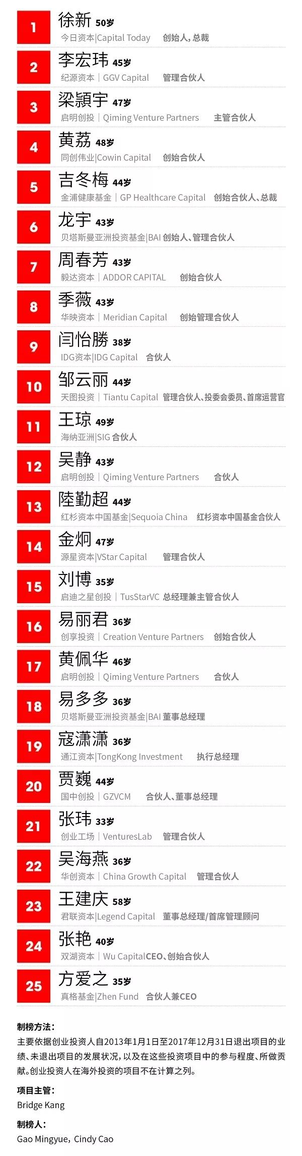 为寻找驰骋创创投领域并取得优异业绩的女投资人,2018年福布斯推出了“中国最佳女性创投人榜”,主要依据创业投资人自2013年至2017年五年内退出项目的业绩、未退出项目的发展状况,以及在这些投资项目中的参与程度、所作贡献。