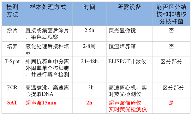 自2000年后核酸扩增技术(NAAT)在美国成为TB诊断的一个常规诊断方法,2008年更新的美国CDC指南中指出对于每一个TB疑似患者至少有一个样本应当使用NAAT法检测。SAT是一种结核病NAAT检测新技术,不仅灵敏度和特异性非常高,且能区分结核分枝杆菌和非结核分枝杆菌。另外,SAT方法采用超声波破碎结核菌,操作简单,容易掌握,而且耗时短,最快2小时报告结果。满足临床上对于结核病诊查的快速、准确的要求。