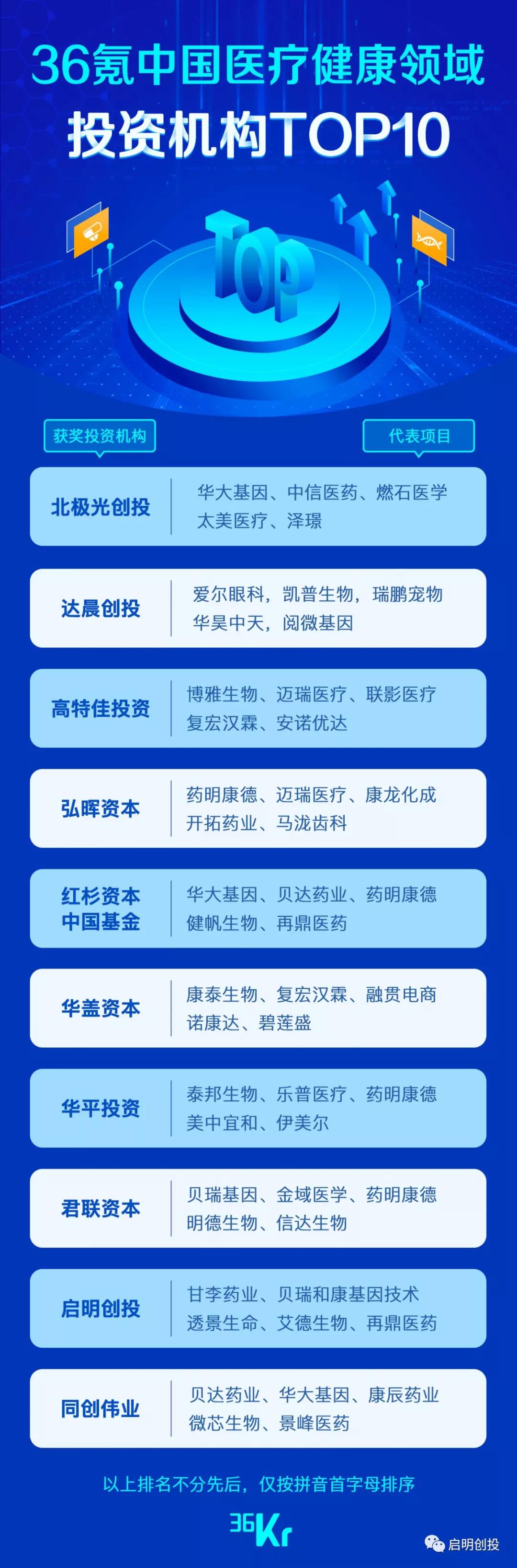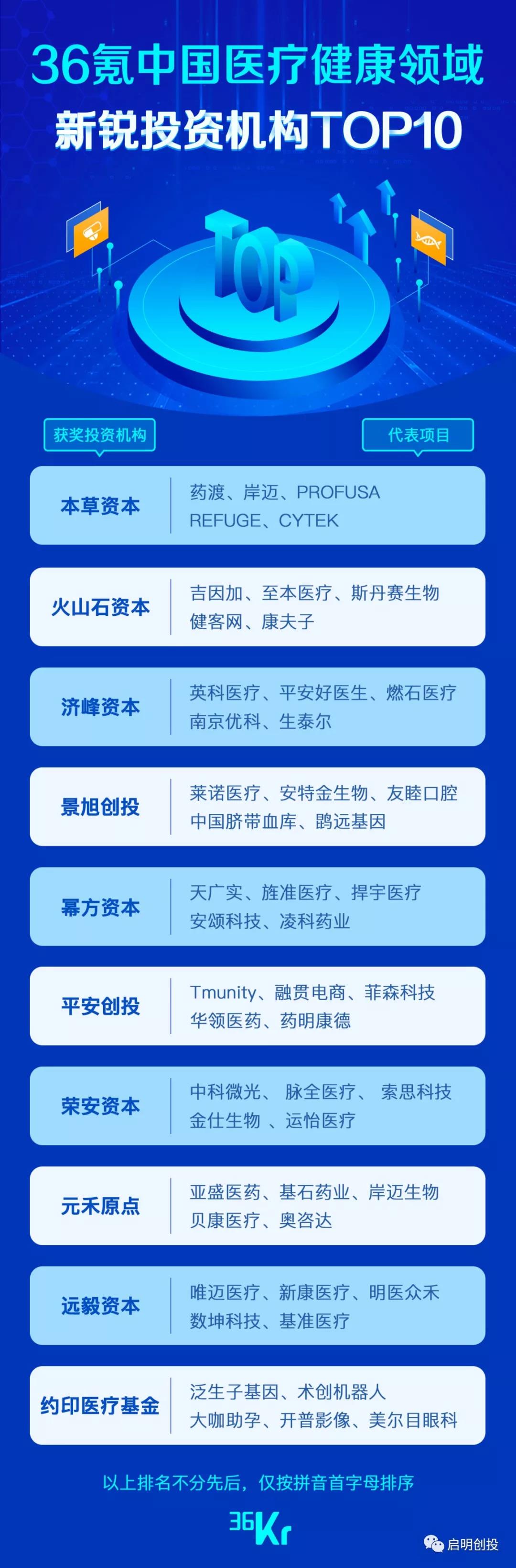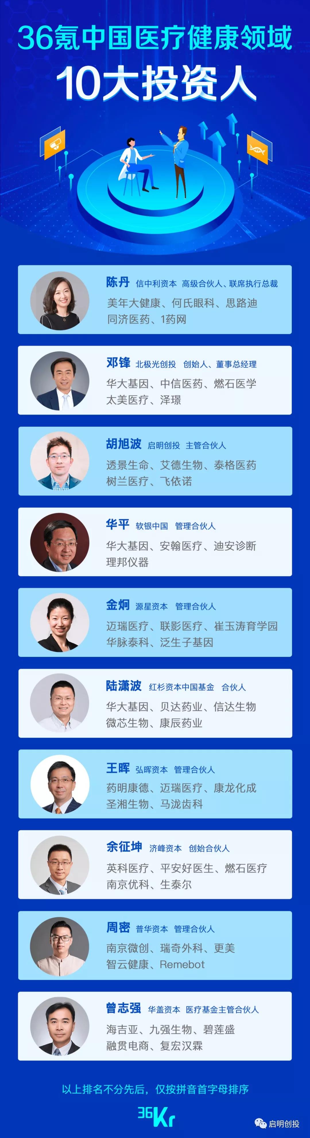 重磅发布!36氪中国医疗健康领域投资榜单发布,启明入选机构榜Top10,胡旭波入选投资人Top10者