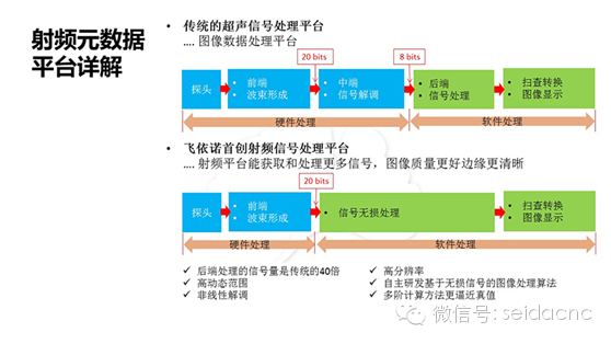 超声诊断技术已成为目前临床多种疾病诊断的首选方法。作为医疗器械行业冉冉升起的一颗新星,飞依诺致力于研究、开发、生产、销售具有全球最领先技术的彩超并提供售后服务,旨在为用户、患者带来持续创新的医疗体验。目前市场上传统的的超声成像技术包括前端处理、中间处理、和后处理三个部分。整个处理流程需要大量硬件支持,特别是中间处理过程,通常需要专用芯片或数字信号处理器来实现,导致处理链路极端复杂。飞依诺的射频元数据超声技术平台实现了超声射频数据从硬件到PC端的无损实时传输和处理,解决了传统超声诊断设备硬件处理射频信号的弊端,大大改善了超声图像的分辨率与清晰度。
