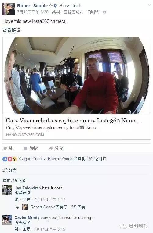 美国硅谷资深博主,UploadVR媒体科技编辑Robert Scoble在Facebook上对Nano的迷你轻便予以了充分肯定,在Facebook上分享的一张全景图片获得了大量点赞。