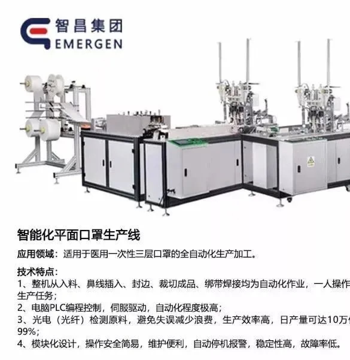 智昌集团自主研发的“医用口罩全自动生产线”单条产线产能可达10万件/天,整机从入料、鼻线插入、封边、裁切成品、绑带焊接均为自动化,一人操作即可完成整线生产任务。目前智昌集团已经在组装三条产线中,后续将生产50条口罩生产线。