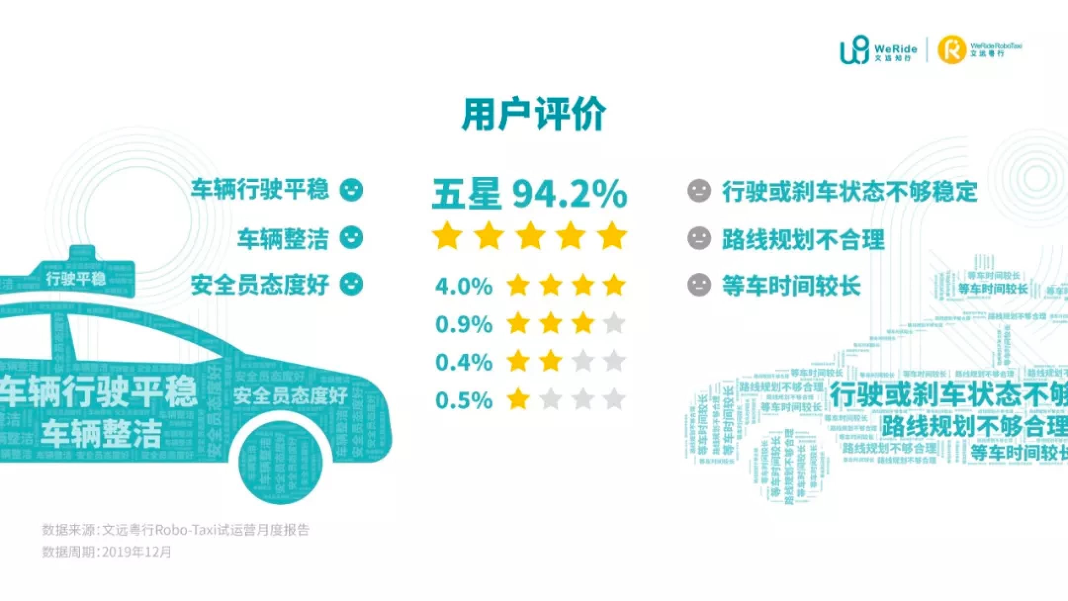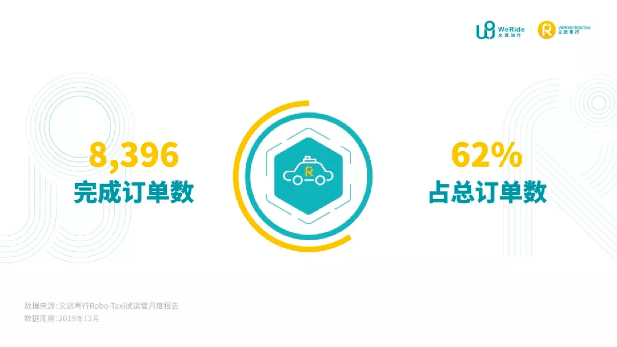 文远粤行试运营首月,即2019年12月01日至31日,共完成8396个出行订单,零安全事故,日均出行服务270.8次,单天最多订单达到438单,服务订单总里程达41140公里,共服务4683名用户。