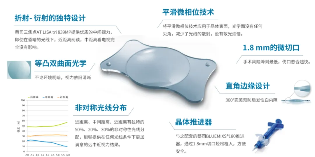 <p class="rtejustify"><span style="font-size:16px;">三焦点人工晶体领域内，蔡司旗下的AT LISA TRI 839MP型人工晶体是中国患者的主要选择。该晶体型号利用亲水性丙烯酸酯材料制成，采用非球面结构。</span></p>
